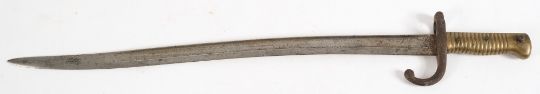 A French St Etienne pattern bayonet:, curved fullered blade dated 1868, single quillon and ribbed brass handle, blade length 58cm.