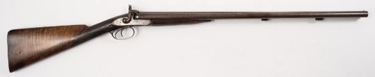 A double barrel percussion cap sporting gun by Charles Lancaster , London, No 1154:, 29 1/2 inch barrels with remains of maker's name and address to rib, engraved tang and hammers, the scroll chased sidelock action signed as per title, steel trigger guard with pineapple finial on a chequered walnut stock with engraved steel butt plate, 117cm long.