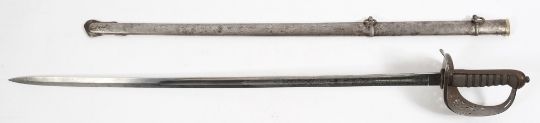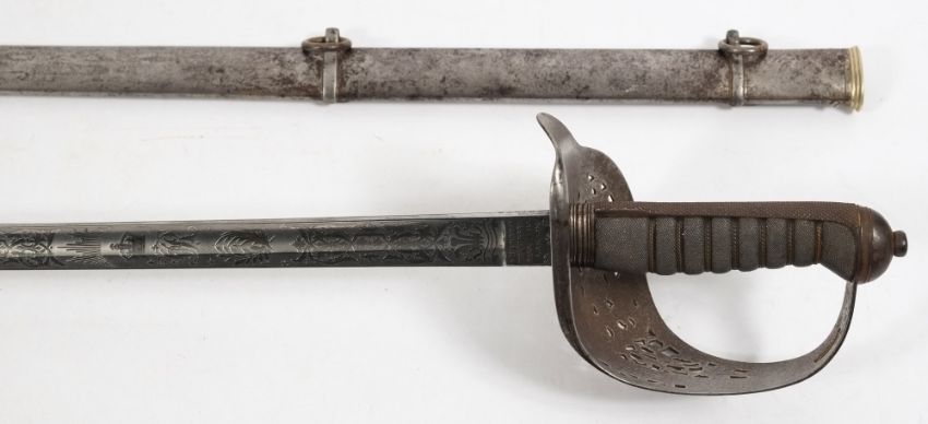 A Victorian Royal Engineer's dress sword by Henry Wilkinson, London No 25816: the straight single edged blade with acid etched decoration wit crown and 'VR' cypher, signed as per title to ricasso', piercework steel hilt and guard with matching crown and cypher, wire bound fish skin grip with chequered backstrap and oval pommel, in a steel scabbard with double suspension loops, blade length 84cm.