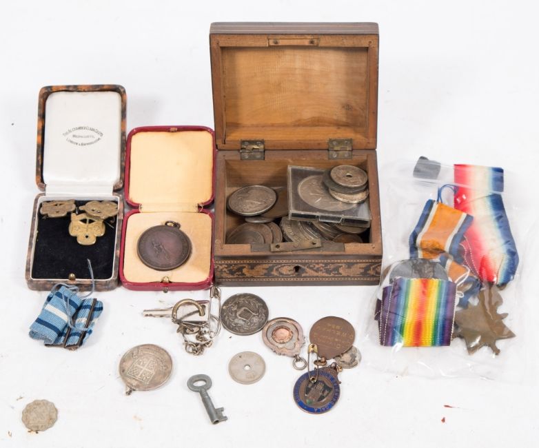 A WWI trio '23039 Gnr C Welham RA':, together with a collection of silver and enamel badges and coins etc.