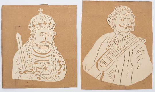 Two early 19th century Continental hand cut coptograph portraits:, one of a man with crown, sword and sceptre, 11cm high, the other of a man in military style attire, 12cm high.