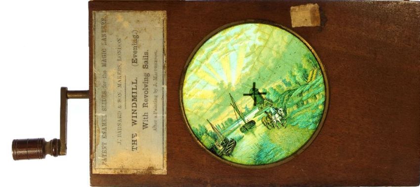 J Barnard & Son, London. A 19th century mechanical magic lantern slide 'The Windmill (evening) with Revolving Sails':, after a painting by J MacPherson, applied label as per title, stamped B&S Patent to frame 10 x 18 frame size (some craquelure to image, main image offset from horizontal)