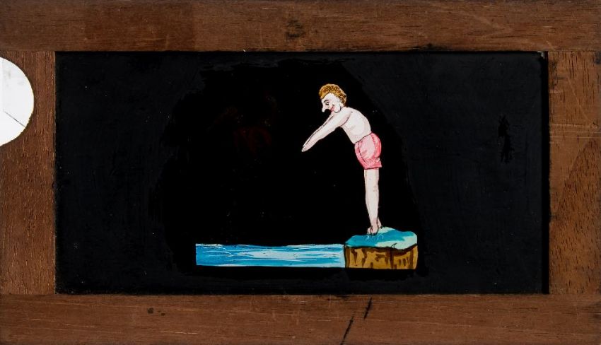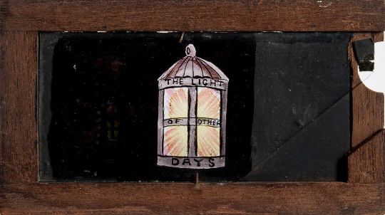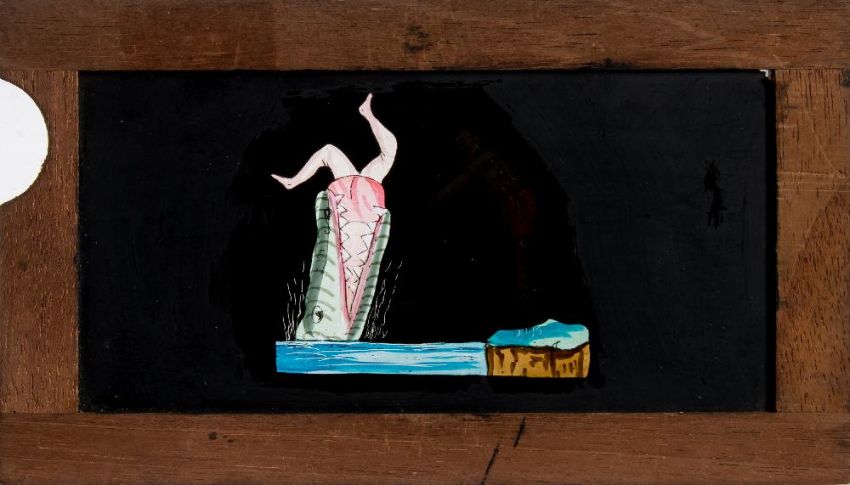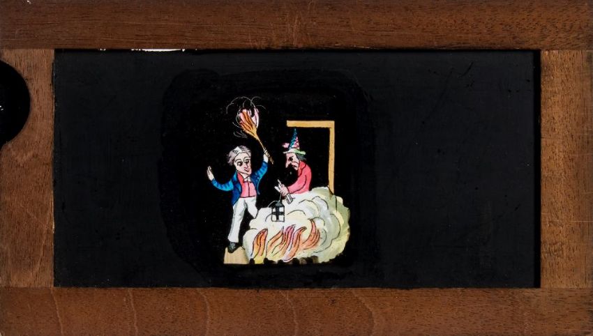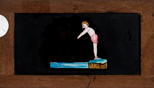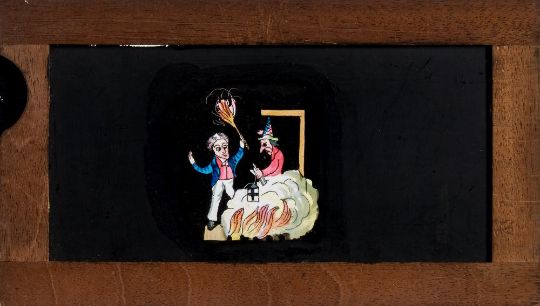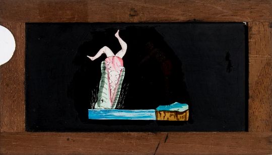 Three 19th century hand painted glass slipping magic lantern slides:, unsigned, one of a diver being eaten by a crocodile, another of two boys with a Guy Fawkes figure, the third as a lantern and night watchman 'The Light of Other Days' all in mahogany frames, 10 x 18cm (3)