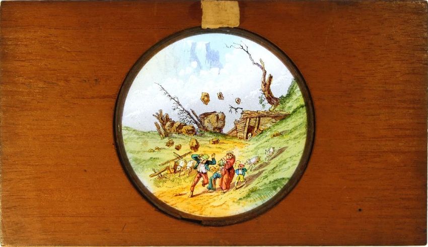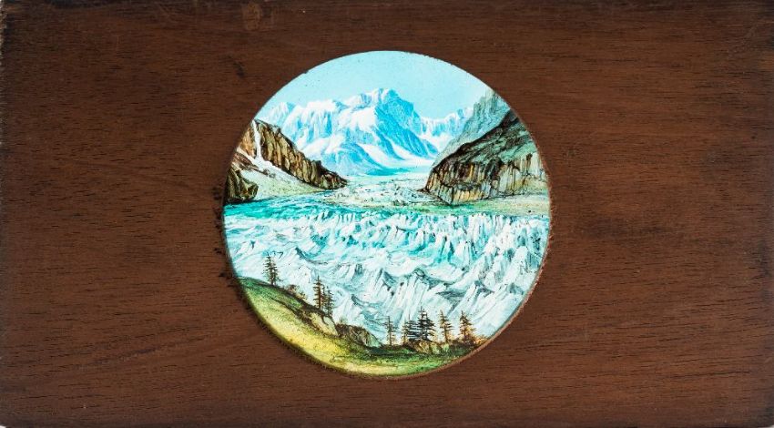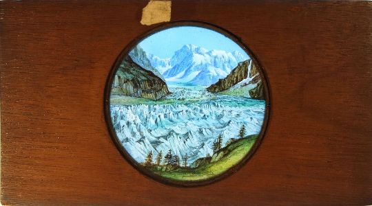Two late 19th century hand painted magic lantern slides 'Glaciers' and 'Avalanche':, maker unknown, both in mahogany frames with inked title to top edge, 10 x 17.5cm (2)