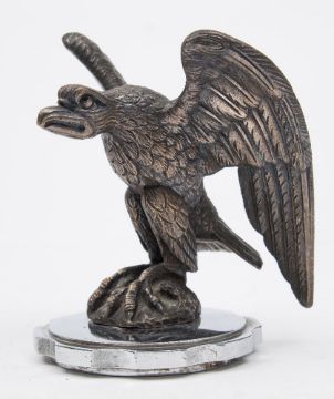 An eagle car mascot:, with raised wings seated on a rocky plinth, mounted on a nickel plated radiator cap, 12.5cm high