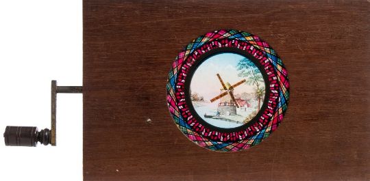 A 19th century chromotrope magic lantern slide:, unsigned, with triple hand painted plates of a windmill on a river surrounded by a kaleidoscope border, 11.5 x 18cm, together with a rackwork lantern slide of a bee around a beehive, 11 x 17.5cm (2)