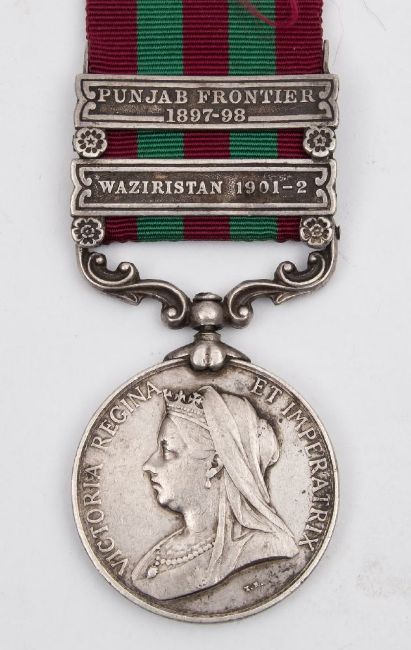 A Victorian India medal with two clasps '485 Sepoy Indar Singh 38th Infantry':.