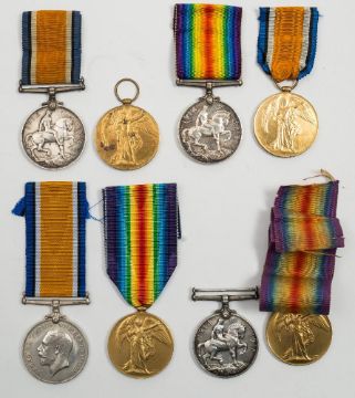 A group of four Devonshire Regiment WWI medal pairs:, '68152 Pte G W Sullivan''2407 Pte J A Hoard''202301 Pte H Vicary''3628 Pte G Palfrey''.