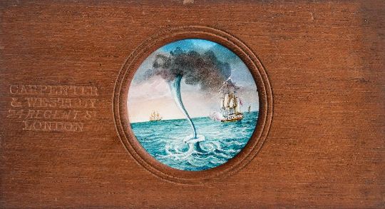 Carpenter & Westley, London. Two hand painted magic lantern slides 'Esquamaux Village' and 'Water Spout':, the latter a smaller 2 3/8inch diameter panel, both stamped as per title to mahogany frames and inked manuscript title to edge, 9.5 x 17.5cm (2)