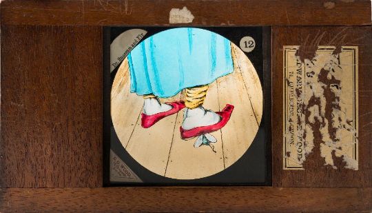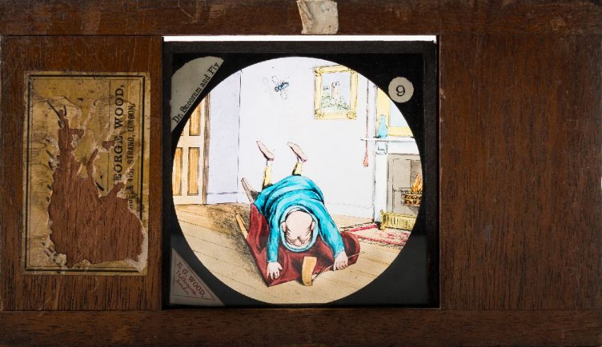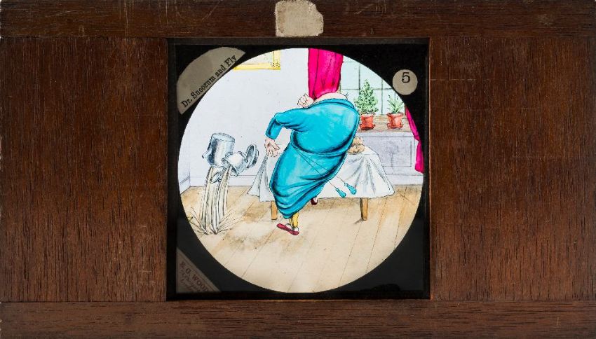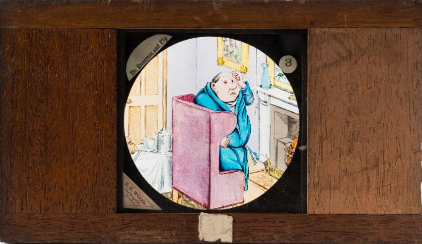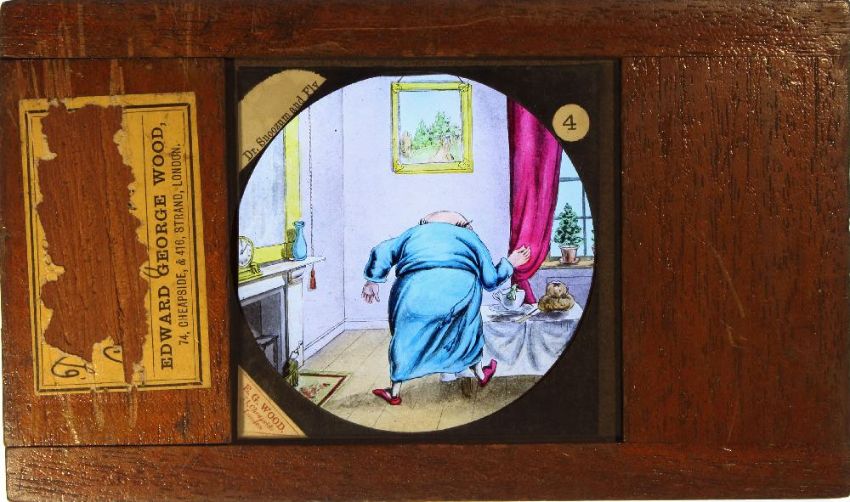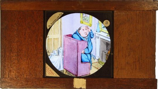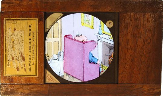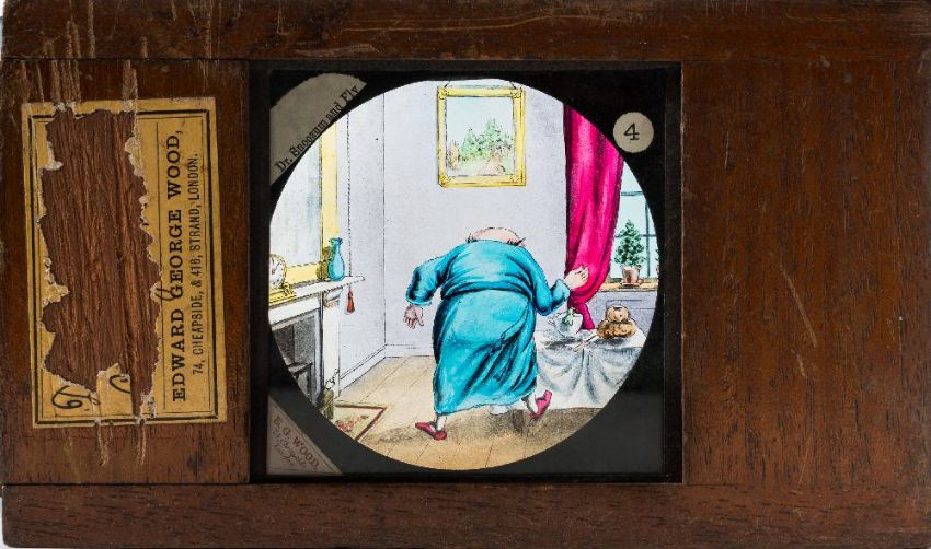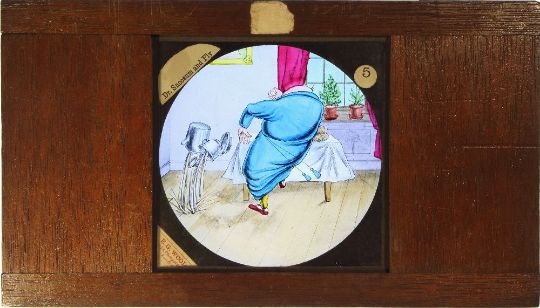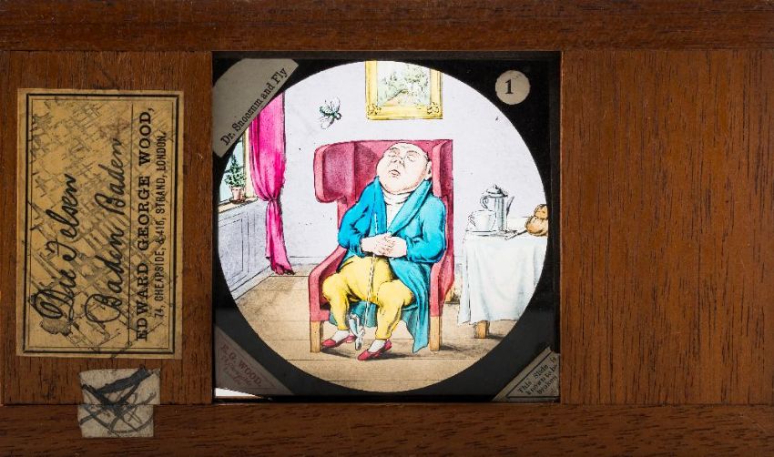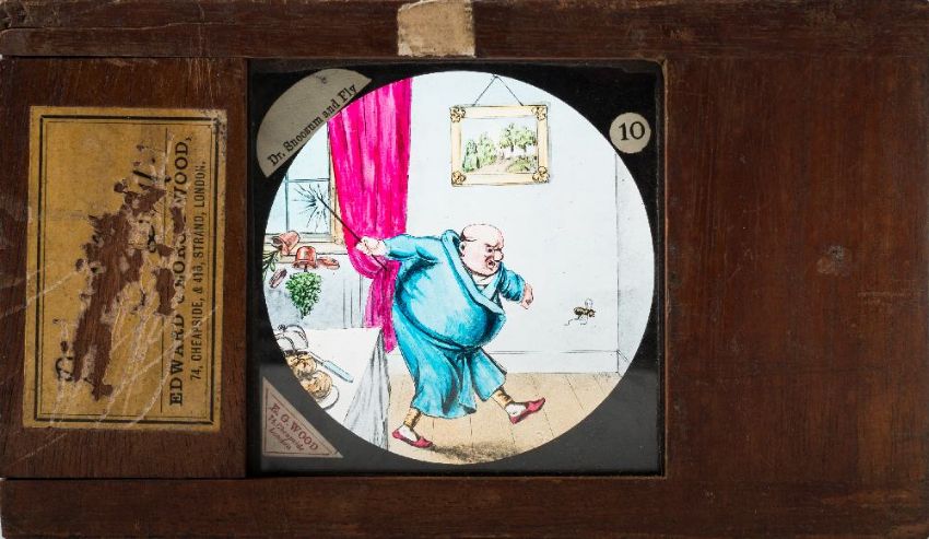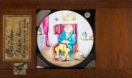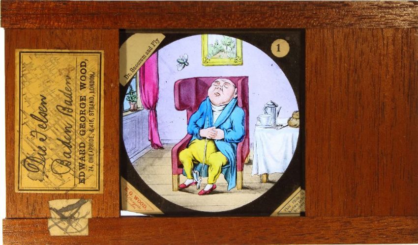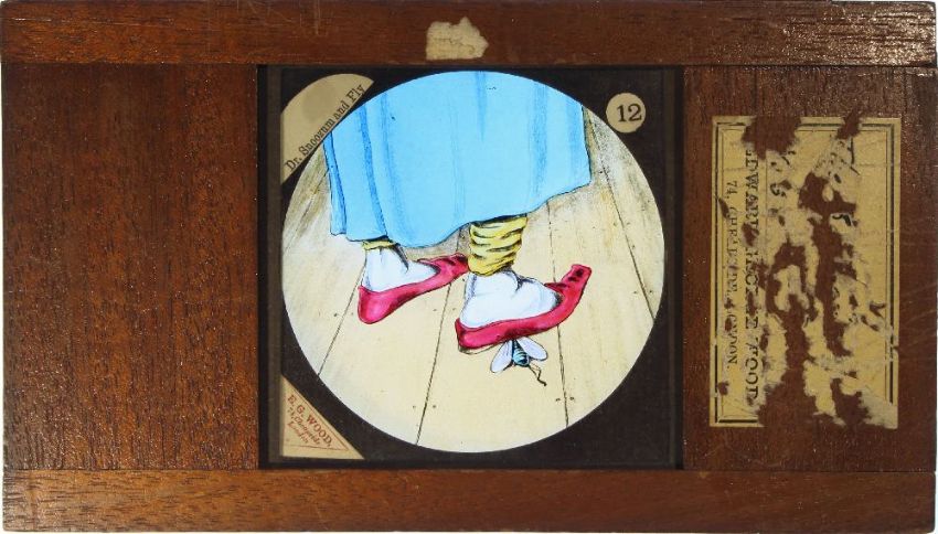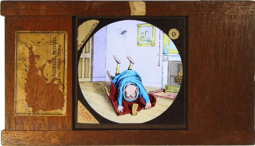 Edward George Wood, London, a set of twelve hand painted magic lantern slides 'Dr Snoozum and Fly':, after 'die Fliege' by Wilhalm Busch, applied paper title and arabic numeral labels, maker's label as per title to mahogany frames, 10 x 17cm,(12) *Note- Slide No 1 is broken to lower left corner but with maker's label 'This slide is known to be broken' to opposite corner.