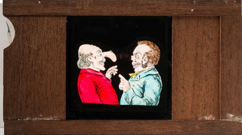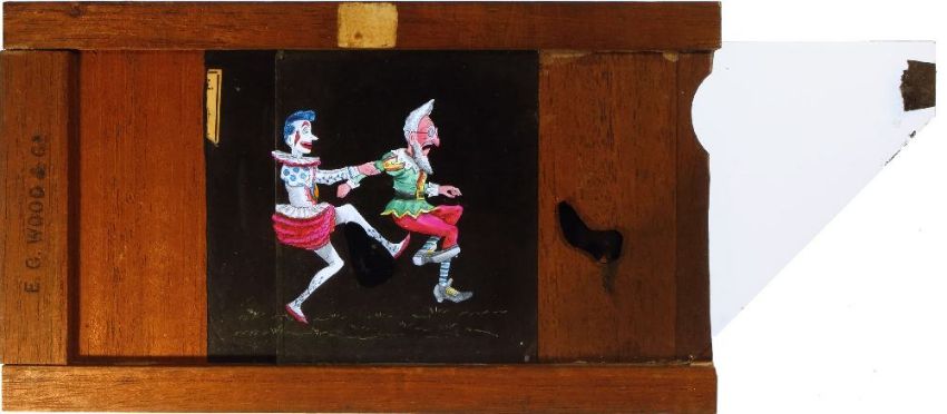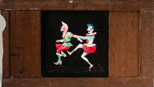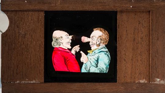 E G Wood & Co, London , two magic lantern slipping slides:, comprising one of two men with comical proboscises, the other of a clown kicking another man in the behind, the mahogany frames stamped as per title, 10 x 18cm.