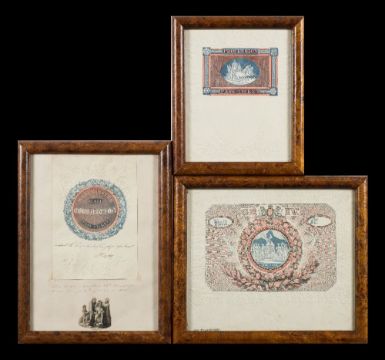 1821 King George IV Coronation, a framed admission ticket to Westminster Abbey:, the central bicoloured print by James Whiting and Robert Branston in black and blue showing the King seated on the throne with classical maidens, laurels and Coat of Arms, surrounded within an embossed frame by Dobbs of national emblems and oakleaf, with Royal seal below marked 'Not Transferable' 22 x 26cm, also a similar Westminster Hall Coronation Pass Ticket by Dobbs inscribed 'Admit this barer to Lord….apartment', 19 x13cm, mounted on paper with manuscript title 'This ticket admitted Mr Hargrave to see George 4th crowned 1821', and an unused 'Procession Pass Ticket' by Dobbs within blue and red showing George IV in a chariot within a rectangular border with embossed border, 20.5 x 16.5cm (3)*Notes- Very good example of early bicoloured security printing first patented by Sir William Congreve in 1821. The compound printing by use of a pantograph and a geometric lathe was developed to stop the increasing levels of counterfeit banknotes.