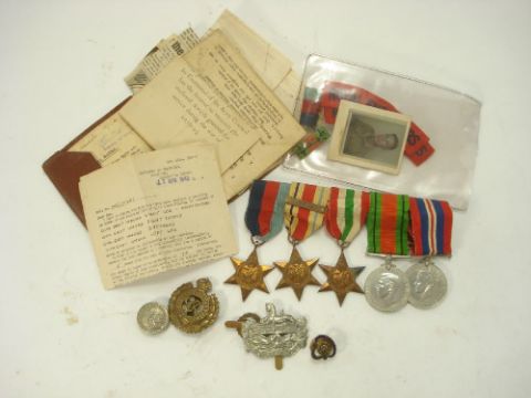 A WWII group of five to 5186118 Pte D C Gale RE:, 1939-45 Star, Africa Star with 1st Army clasp, Italy Star, Defence Medal and George VI Coronation Medal, together with cap and shoulder badges, Army Service & pay book , a photograph of the recipient and related ephemera.