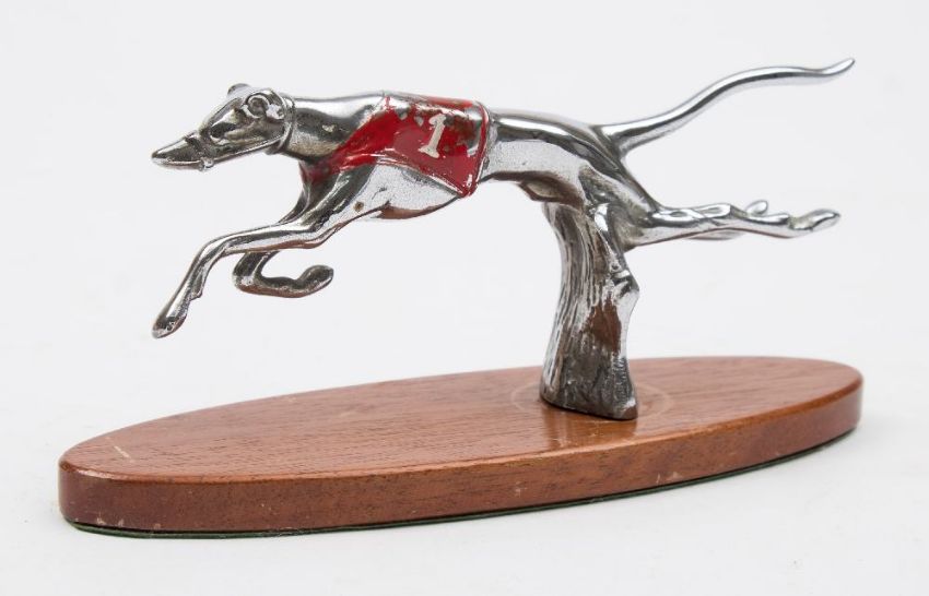 A chrome plated racing greyhound car mascot:, in red and white vest, mounted on later wooden base, 8cm high