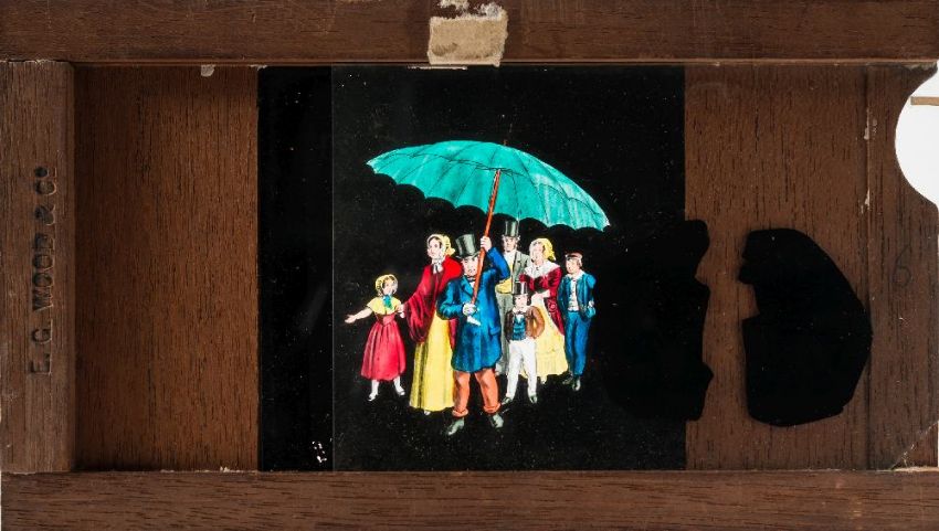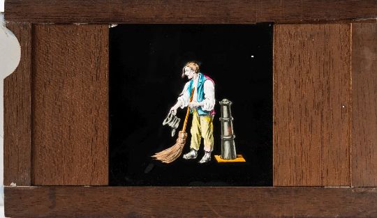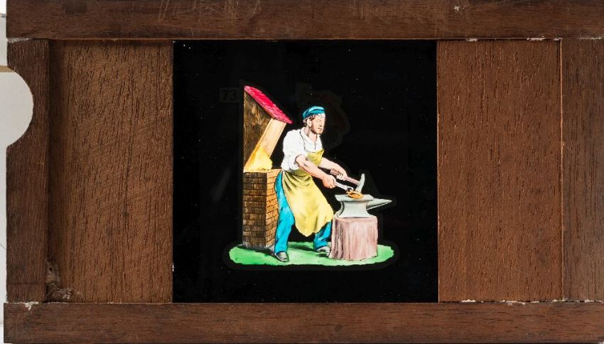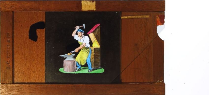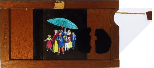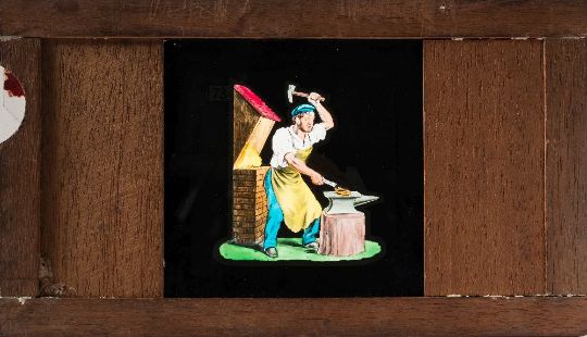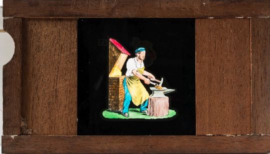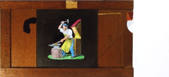 E G Wood & Co, London , a group of three magic lantern slipping slides:, comprising No 83 The Family Umbrella, No 73 Blacksmith at Work, and a Road Sweep tilting his hat, the mahogany frames stamped as per title, 10 x 18cm