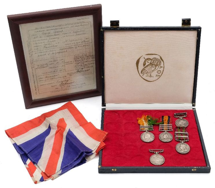 A Victorian India and Africa Campaign group of five '1322 Sgt G Stamp Devon R':, India General Service Medal with one clasp, India Medal with two clasps, Queen's South Africa Medal with three clasps, King's South Africa Medal with two clasps and Edward VIII Army LSGC Medal, together with the recipients service papers in glazed frame and a silk Boer War commemorative handkerchief.