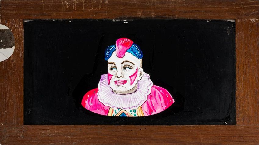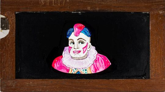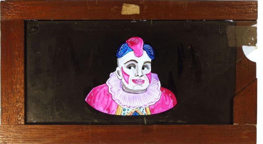 A magic lantern slipping side of a clown with moving eyes:, unsigned, in a mahogany frame. 10 x 18cm.