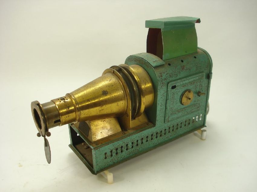A late 19th/early 20th century brass and tinplate magic lantern:, the body over painted green, with 6 inch focusing lens, later electric conversion, (main lens cracked), together with three empty lantern slide boxes. (a lot)