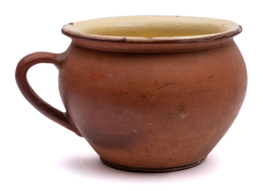 Two pottery chamber pots and a bedpan: attributed to the Verwood or East Dorset potteries comprising a tall example with strap handle the interior with olive green glaze, another of more traditional squat form with cream glazed interior, the bedpan of shallow circular form with an oblique neck under green and orange splashed glazes, early/mid 19th Century, 19 - 26cm diameter. [3]