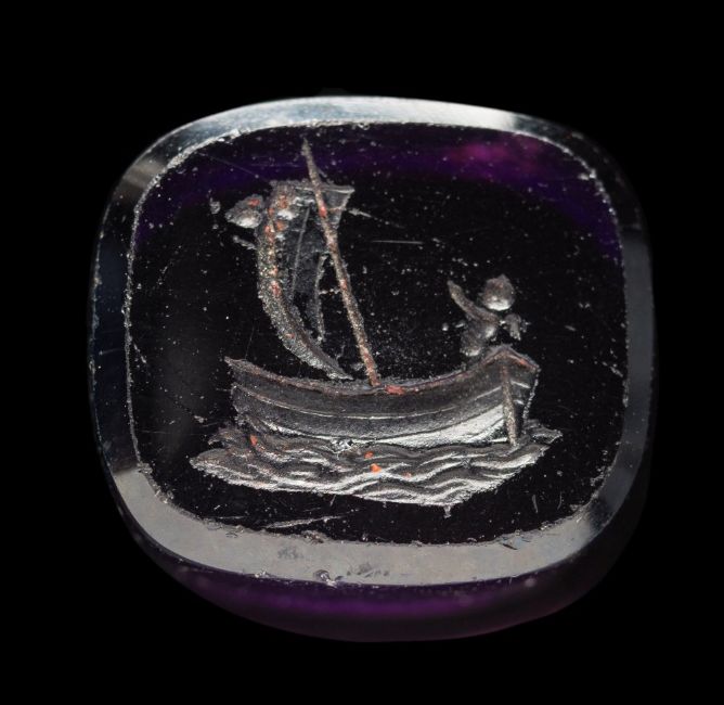 A group of ten coloured and clear glass intaglio seals: including a Roman head and shoulders bust by Warner; two other busts unsigned; a horse; devil pushing two birds in a coup; a bird on a branch 'My love endures after death'; cherub sailing; angel rowing; owl over a teapot; two hearts and two heads 'two hearts may agree, two heads may differ' [10].