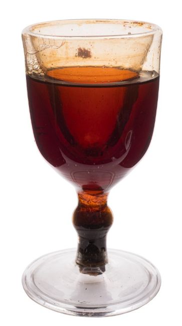 A deception wine glass: probably American and of hollow construction with ogee bowl and knopped stem on a conical fold over foot, the interior partially filled with a composite liquid in imitation of wine, later 19th Century, 15cm high.* Note Similar examples are illustrated in Burlesque Paraphernalia Catalog 439, page 95 which was published by De Moulin Bros & Co. of Greenville, Illinois who specialised in producing items for trick performances, initiation stunts and fraternity pranks.