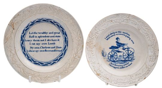 Two nursery ware plates: both transfer decorated in blue with embossed floral and foliate borders comprising an example attributed to Thomas Brough and decorated with a Dandy on a hobby horse or velocipede with the caption 'I scud along on this machine, While many a crowd is gaping seen, Accelerating power, Gaining ten miles an hour', the latter with the caption 'Let the wealthy and great, Roll in splendour and state, I envy them not I declare it, I eat my own lamb,, My own chickens and ham, I shear my own fleece and I wear it', early/ mid 19th century, 15 and 16.5cm diameter, [damages].
