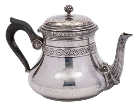 A French silver teapot: of squat globular form, with banded floral decoration, 17cm. long, 407gms, 13.11ozs.