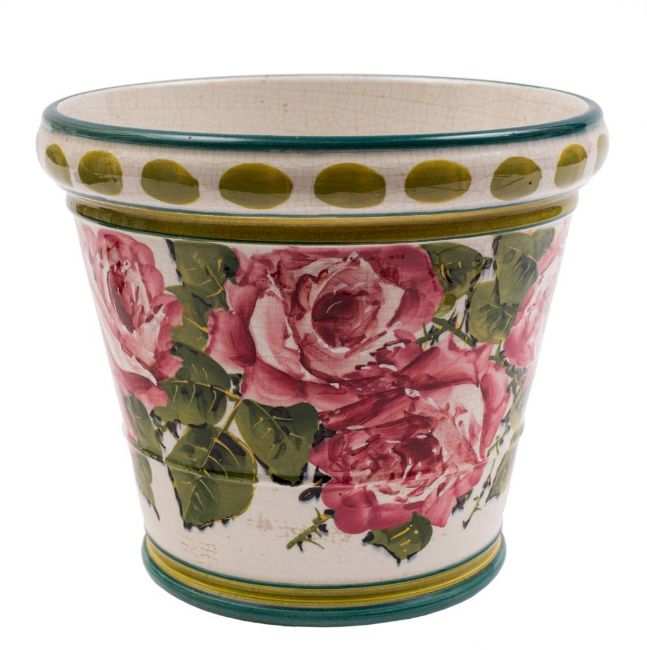 A Bovey Tracey Wemyss pottery Stuart flower pot: decorated with a broad band of pink cabbage roses, impressed and painted Wemyss and T. Goode & Sons London, 18cm high.