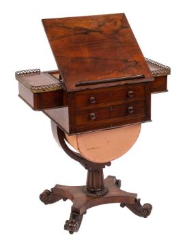 A William IV rosewood combined reading, work and games table: with a central adjustable rachetted reading slope with a detachable ledge, having a fitted drawer with various divisions, a further drawer below, leather-lined for backgammon and with an upholstered U-shaped wool well, having a brass galleried compartment to either side, one with fitted pen drawer, the other with a plain drawer, on reeded column, quartrefoil platform and carved foliate scroll feet, terminating in castors, 72cm (2ft 4¼in) wide