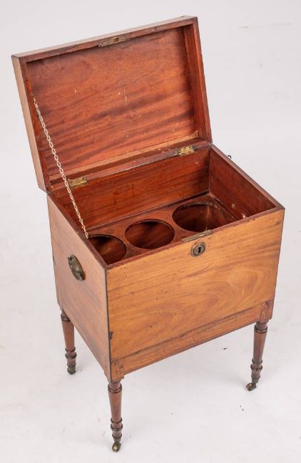 A Regency mahogany and inlaid rectangular cellarette:, bordered with ebony lines, the hinged top enclosing an interior fitted with six circular divisions, having brass drop carrying handles to the sides, on ring-turned tapered legs, terminating in brass cappings and castors, 48cm (1ft 6¾in) wide.