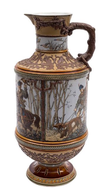 A large Mettlach stoneware ewer, signed 'Warth': with oak branch handle, moulded, incised and decorated overall with hunting scenes within oak branch and diaper borders, impressed factory marks with shape no.1690, 41cm high [tiny chip to rim].
