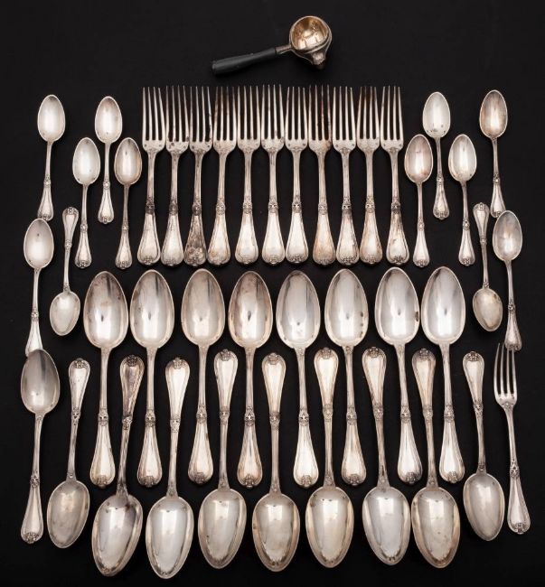 A French silver part flatware service: monogrammed, includes eleven table forks, a dessert fork, fifteen tablespoons, three dessert spoons, twelve teaspoons and a sterling silver strainer, weighable silver 2737gms, 88.00ozs.