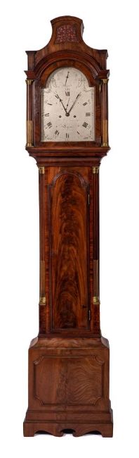 Thomas Oldmeadow, Lynn, a mahogany longcase: the eight-day duration movement striking the hours on a bell, the twelve-inch break-arch silvered dial engraved with black Roman hour numerals, Arabic five-minute outer numerals, a subsidiary seconds dial to the centre and engraved with the maker's name Thos. Oldmeadow, Lynn, with classical floral engraved decoration to the corners and arch and blued steel hands, with an engraved dial within the arch for strike/silent, the mahogany case having fluted quarter columns with brass stops and cast-brass capitals, with a shaped moulding to the door, the hood having fluted pillars with brass stops and cast-brass capitals and surmounted by a pagoda top with a wood sound fret to the front and three brass ball-and-spire finials, the base with a raised shaped panel, a double plinth and standing on bracket feet, height 234cm including finial. *Biography Thomas Oldmeadow is recorded as working in Lynn (Kings Lynn), Norfolk from circa 1784 until after 1798 holding three policies with the Royal Exchange Insurance. A number of longcase clocks are recorded, all with silvered dials as in this example. Both the case and dial show similarities with longcase clocks made by another Kings Lynn clockmaker James Saddleton. *Notes Reference Clifford & Yvonne Bird Norfolk & Norwich Clocks & Clockmakers Pub. Phillimore & Co Ltd 1996.