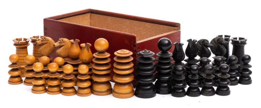 An English St Georges pattern type boxwood and ebonised chess set: both kings missing their finials, 7cm. high, the pawn 4.75cm.