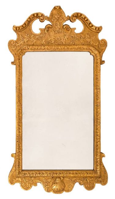 An 18th Century carved giltwood and gesso wall mirror:, the swan neck broken pediment with egg and dart ornament centred by a foliate cartouche and with a scrolling foliate and flowerhead frieze, the rectangular plate within a foliate slip and with a scallop shell to the base, 103cm (3ft 4 1/2in) x 55cm (1ft 9 1/2in).