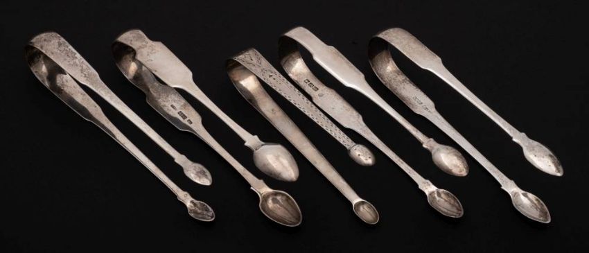 A George III Irish provincial pair of sugar tongs, maker Carden Terry, Cork circa 1790: with bright cut decoration, together with four pairs of Irish silver sugar tongs, various makers and dates, total weigh of silver 241gms, 7.76ozs.