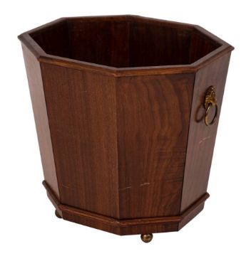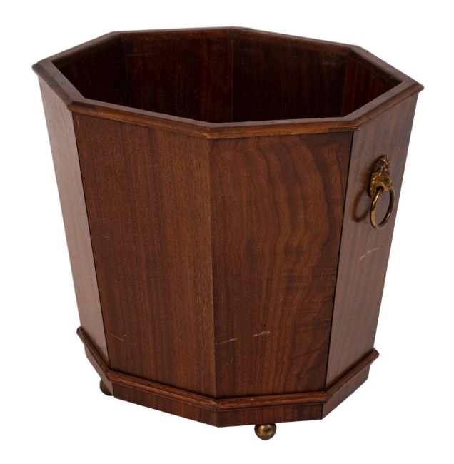A mahogany octagonal jardiniere in the Regency taste:, having tapering sides and brass lion's mask ring handles, on brass ball feet, 45cm (1ft 5¾in) across, 43cm (1ft 5in) high.