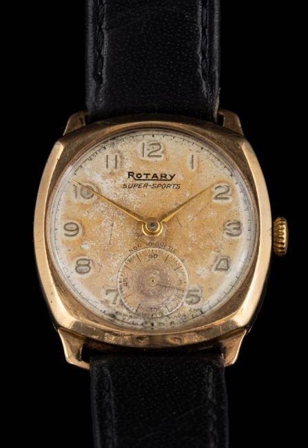 Rotary Super Sports. A 9ct gold cased mechanical wind wristwatch circa 1952: the dial with Arabic numerals and subsidiary seconds dial, on black strap.