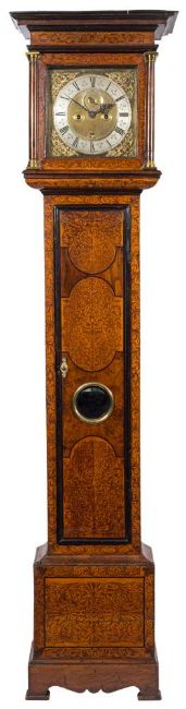 John Sweeby London, a mulberry, walnut and seaweed marquetry longcase clock: the eight-day duration movement having finned pillars and striking the hours on a bell with an inside countwheel, the twelve-inch square brass dial having a raised silvered chapter ring engraved with black Roman hour numerals, Arabic five-minute numerals and decorative half-hour markings, the matted dial centre having ringed winding holes, a raised silvered seconds dial and a date aperture with engraved surround, with blued steel hands and cherub-head cast-brass corner spandrels, engraved either side of VI o'clock with the maker's name John Sweeby Londini fecit, the flat-top walnut case inlaid having shaped marquetry panels to the trunk door and a round lenticle glass and inlaid marquetry to the trunk, base, hood and convex throat moulding, with the tapered hood pillars having cast brass capitals, with ebonised mouldings, complete with brass bund weights, height 211cm.*Biography John Sweeby (Sweby) is recorded as having been apprenticed to William Speakman in 1663 and a member of The Clockmakers' Company from 1671 until 1690.*Notes Reference Brian Loomes Watchmakers and Clockmakers of the World, Pub. NAG Press 1988.