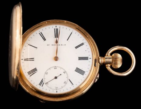 H. Moser & Cie. A '14K' stamped engine turned hunter pocket watch: no. 29635 the white enamelled dial with Roman numerals and subsidiary seconds dial, approximately 52mm case diameter, 105gms gross weight.