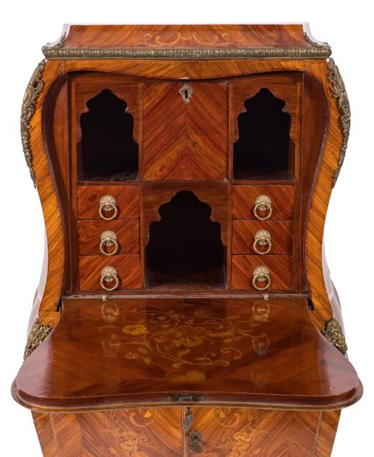 A 19th Century French kingwood, floral marquetry and gilt metal mounted secrétaire à abattant:,of cartouche bombe outline, crossbanded and decorated with sprays of flowers and foliage, having a cavetto moulded cornice and frieze with applied foliate band, the hinged fall enclosing a fitted interior with small drawers, pigeon holes and an enclosed compartment, the cupboard below enclosed by a pair of doors between curved sides with applied cabochons and floral foliage at the angles, on ogee feet with sabots, 74cm (2ft 5in) wide, 155cm (5ft 1in) high.