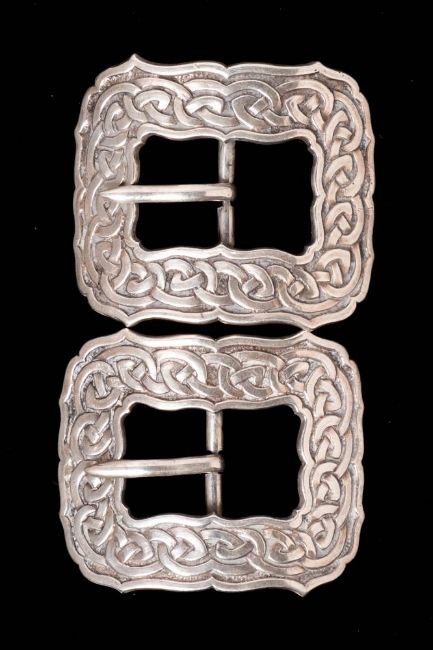 A pair of Iona silver shoe buckles, maker Alexander Ritchie, stamped Iona, bears hallmarks for Glasgow, 1921: of rectangular outline with Celtic Knot decoration, 5.5cm. wide, 45grms, 1.45ozs.