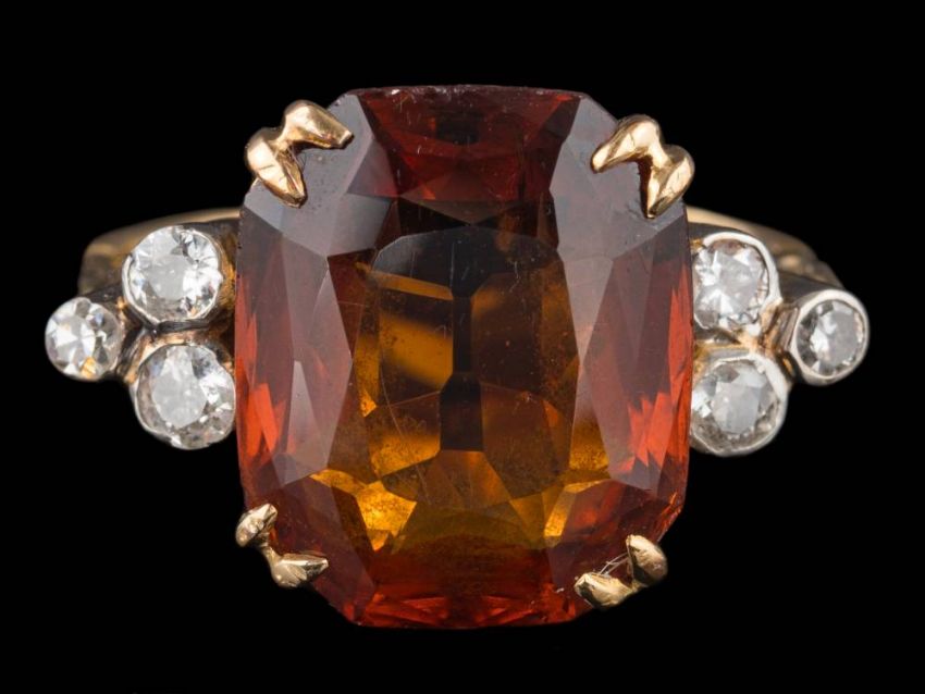 A rectangular citrine and diamond ring: the citrine approximately 13.5mm long x 11mm wide x 6.5mm deep, between diamond trefoil clusters, the shank stamped '9ct', ring size J 1/2.