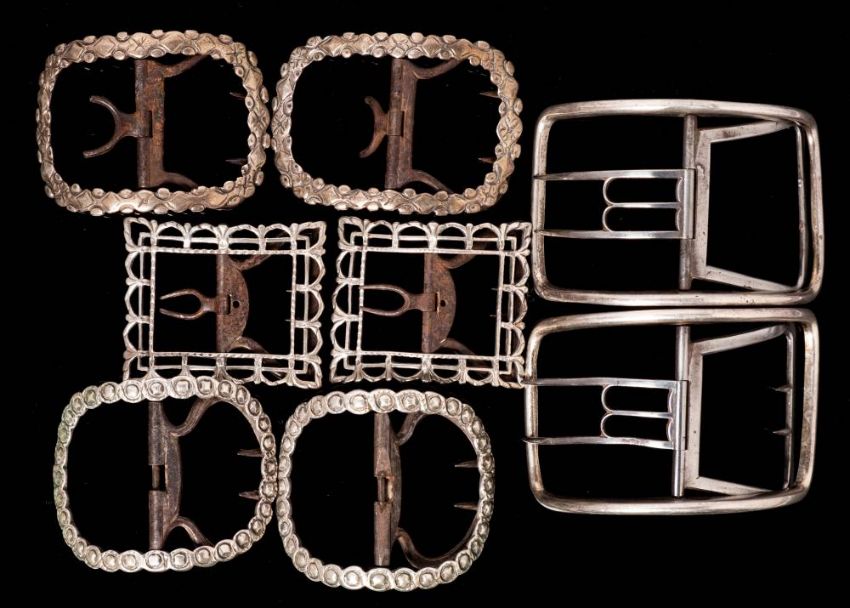 A pair of George III silver and steel shoe buckles, maker Stephen Adams II, London no date letter: of plain rectangular form, together with three other pairs of Georgian silver shoe buckles, various makers. (4).