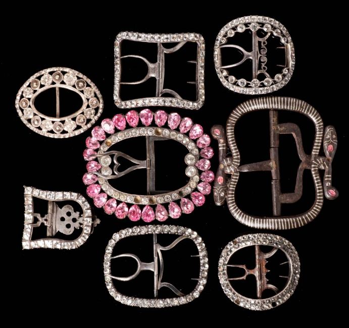 Seven assorted late 18th/early 19th century paste set shoe buckles: various sizes, and a large steel buckle of entwined serpents.