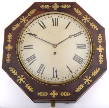 A 19th Century octagonal mahogany and inlaid wall timepiece: having an eight-day duration, single-fusee timepiece movement, the twelve-inch round convex dial having black Roman numerals and blued steel moon hands, the octagonal mahogany case inlaid with floral brass decoration, height 44cm.