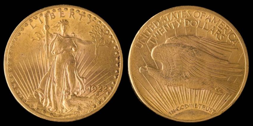 An American Saint Gaudens 20 dollar coin dated 1922,: approximately 33.5gms gross weight.