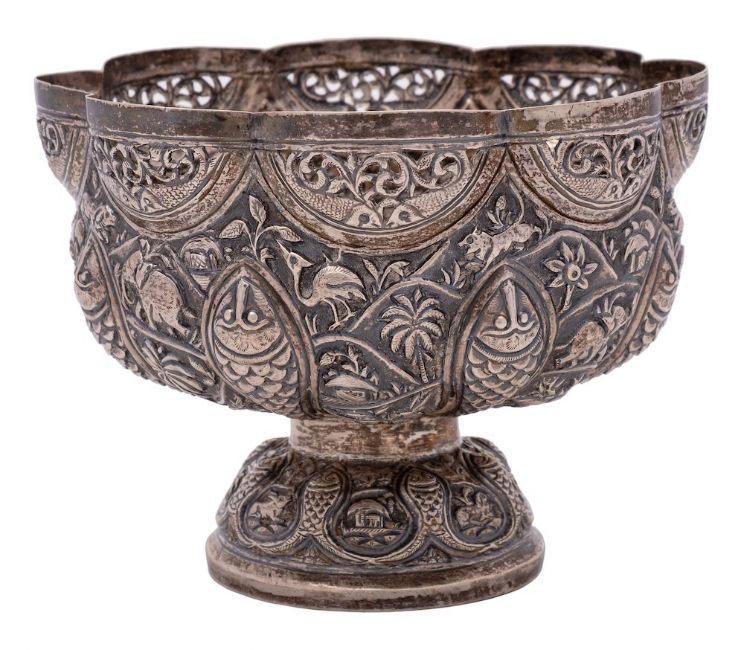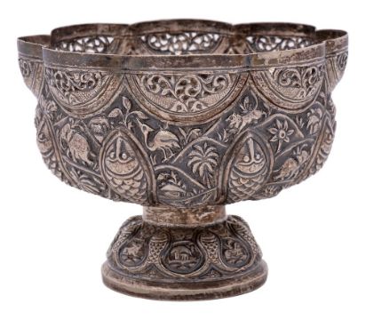 An Indian silver bowl: of lobed circular outline, with embossed decoration of figures, fish and animals, on a domed circular foot, 17cm diameter, 326gms, 10.49ozs