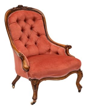 A lady's Victorian carved walnut armchair:, the upholstered button down back with flowerhead and foliate cresting, having outswept scroll arm supports and upholstered stuff over serpentine seat, on cabriole legs, headed with flowerheads.