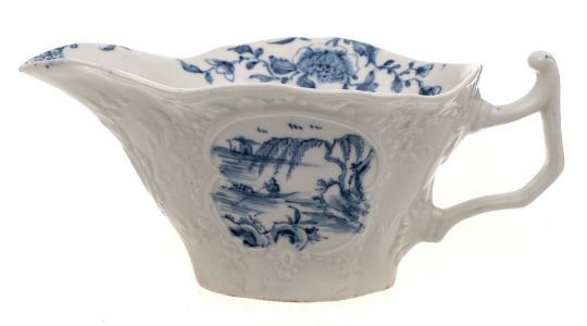 A rare First Period Worcester sauceboat: of deep quatrelobed form with angular handle and moulded scroll and foliate cartouches, painted in the 'Boatman' pattern [I.B.22B] with on one side a Chinese lake scene with boatman and willow tree, a two-storied building to the other, workman's mark, circa 1753-55, 15cm. * Provenance Paper label for 'Albert Amor Ltd. 18th Century Blue & White Exhibition 1979 no.14'.